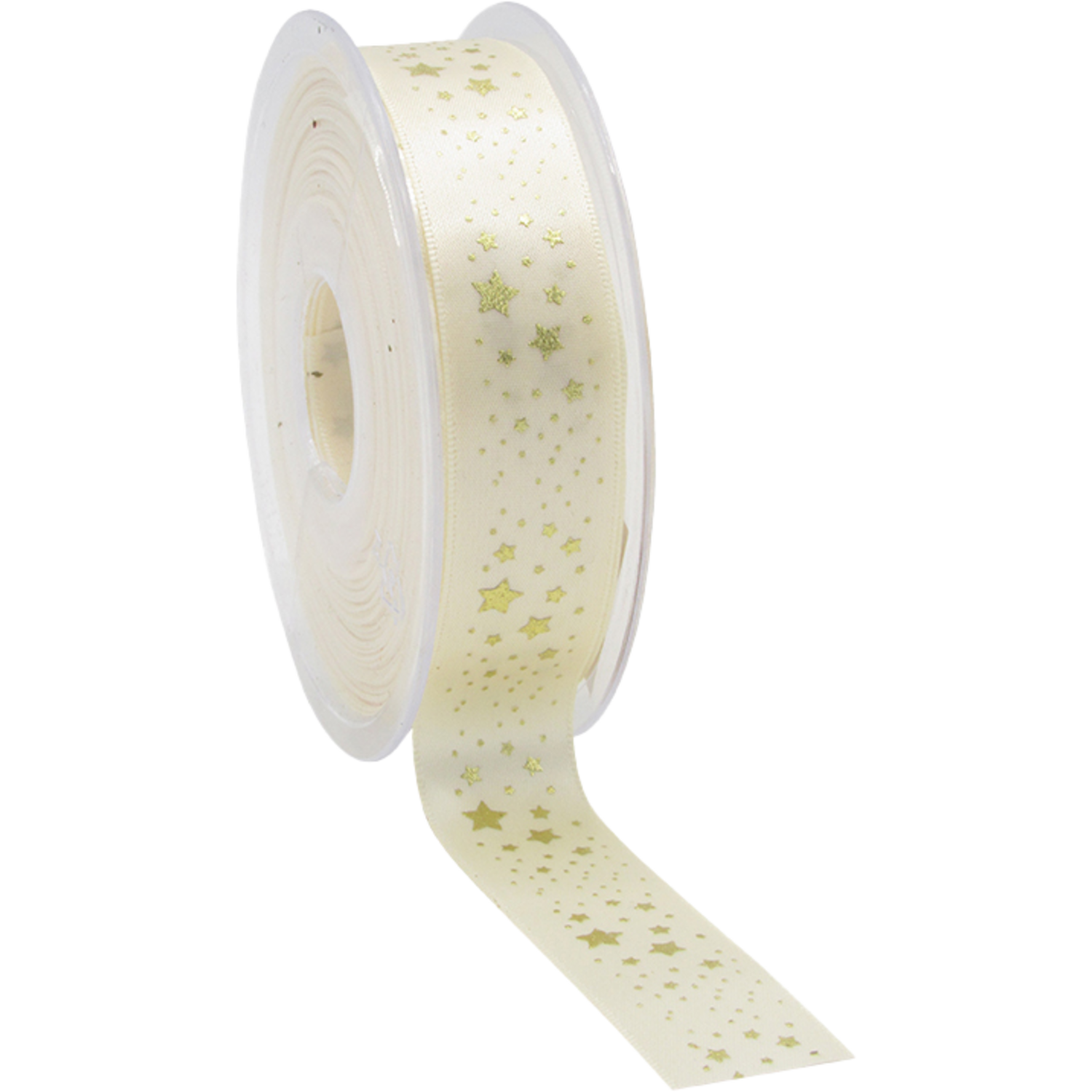 Breng de magie van de feestdagen tot leven met dit ivoorkleurige lint met sterren opdruk! Het lint is 23 mm breed en maar liefst 25 meter lang.